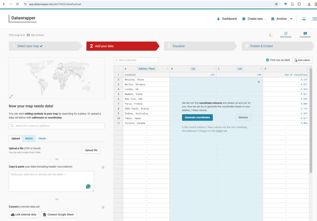 First, we paste the data from the Pivot Table into Datawrapper. The platform will then prompt us to confirm whether it should generate coordinates for the listed cities.