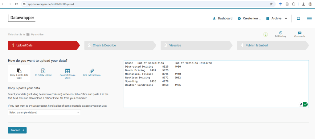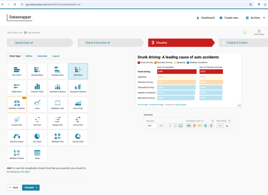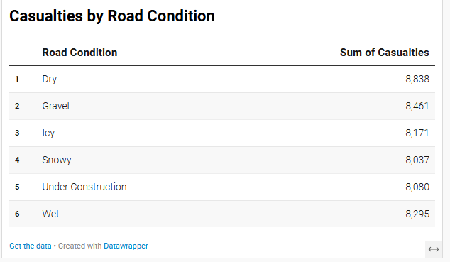 For the third visualization, we aim to analyze Casualties by Road Condition, specifically exploring whether icy roads lead to more fatalities. To effectively present this data, we will use the “Chart” function in Datawrapper.
